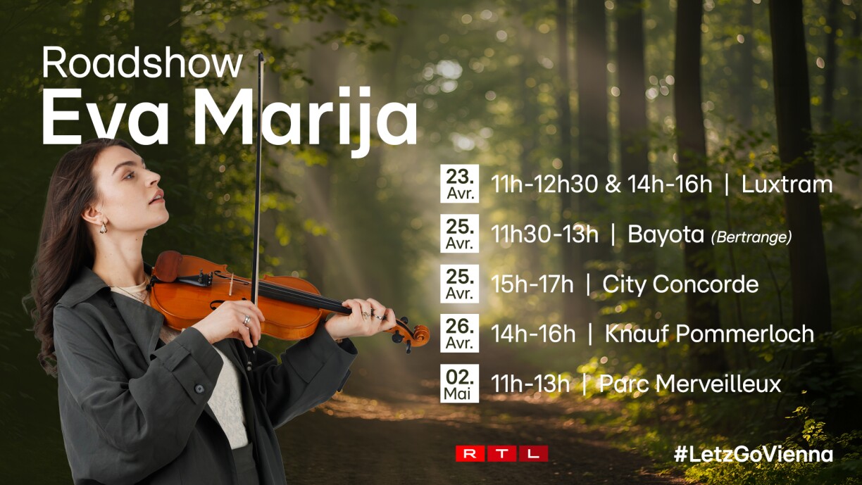 La roadshow débutera le 23 avril à Luxembourg-Ville, où Eva se produira à deux reprises à bord du tram entre Luxexpo et Bonnevoie – une fois le matin et une autre fois dans l’après-midi. Deux jours plus tard, le 25 avril, elle fera étape à Bertrange au Bayota, avant de poursuivre le même jour avec une autre apparition au City Concorde. Le 26 avril, le roadshow continuera au Knauf Pommerloch, avant de se conclure le 2 mai au Parc Merveilleux.