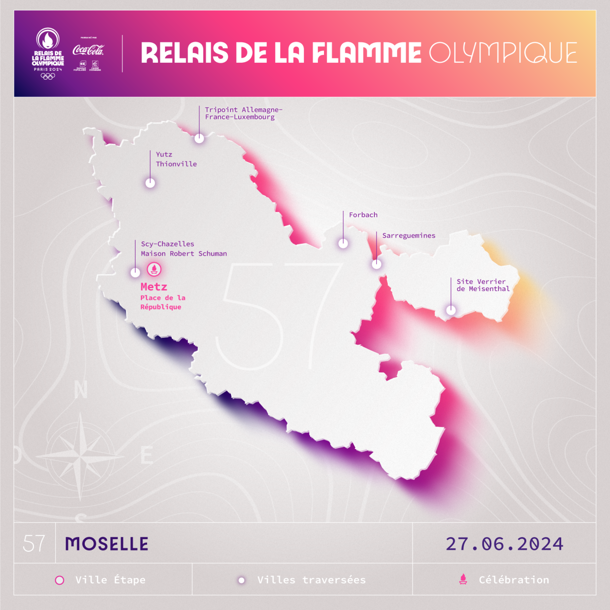 Le jeudi 27 juin 2024, la flamme, célébrée en Alsace la veille, arrivera dans le département de la Moselle par l’Est. Le relais de la flamme passera par sept étapes mosellanes.
