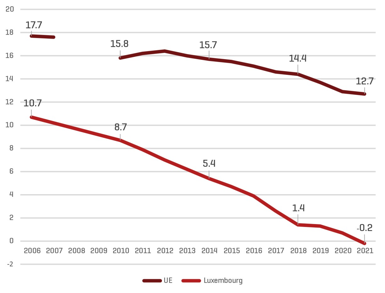 Le Statec l’estime à -0.4% pour 2022. L’enquête sur la structure des salaires de 2022, qui sera menée auprès des entreprises au cours de l’année 2023 permettra une analyse plus approfondie à ce sujet.