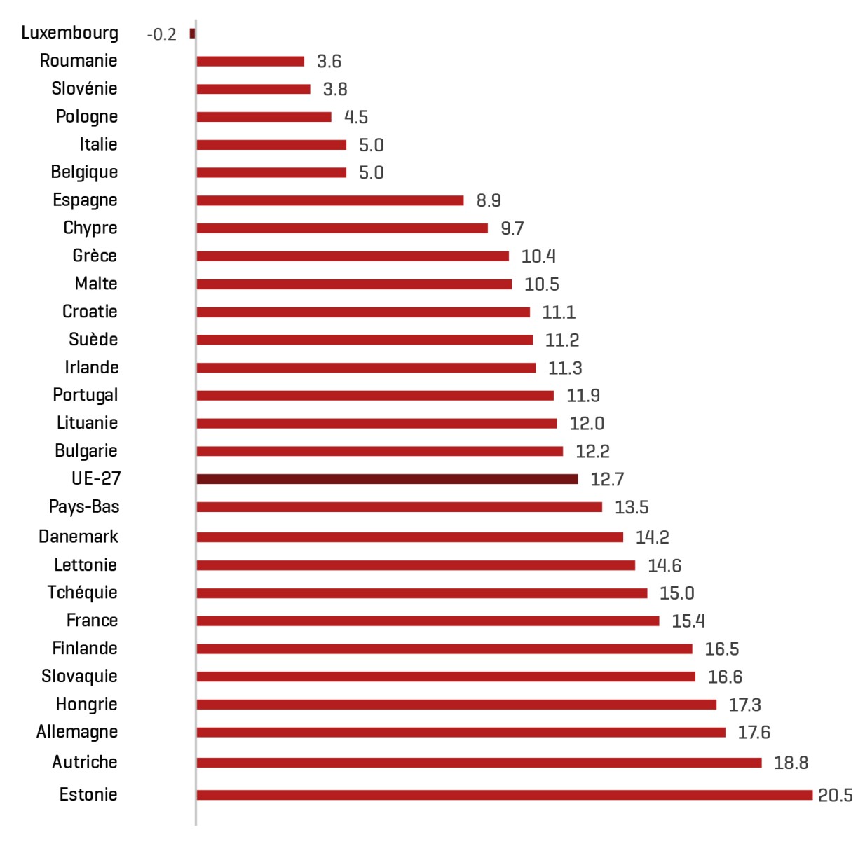 La moyenne européenne se situe à 12.7% d’écart en faveur des hommes. Chez nos voisins, il est de 17.6% en Allemagne, 15.4% en France et 5.0% en Belgique.