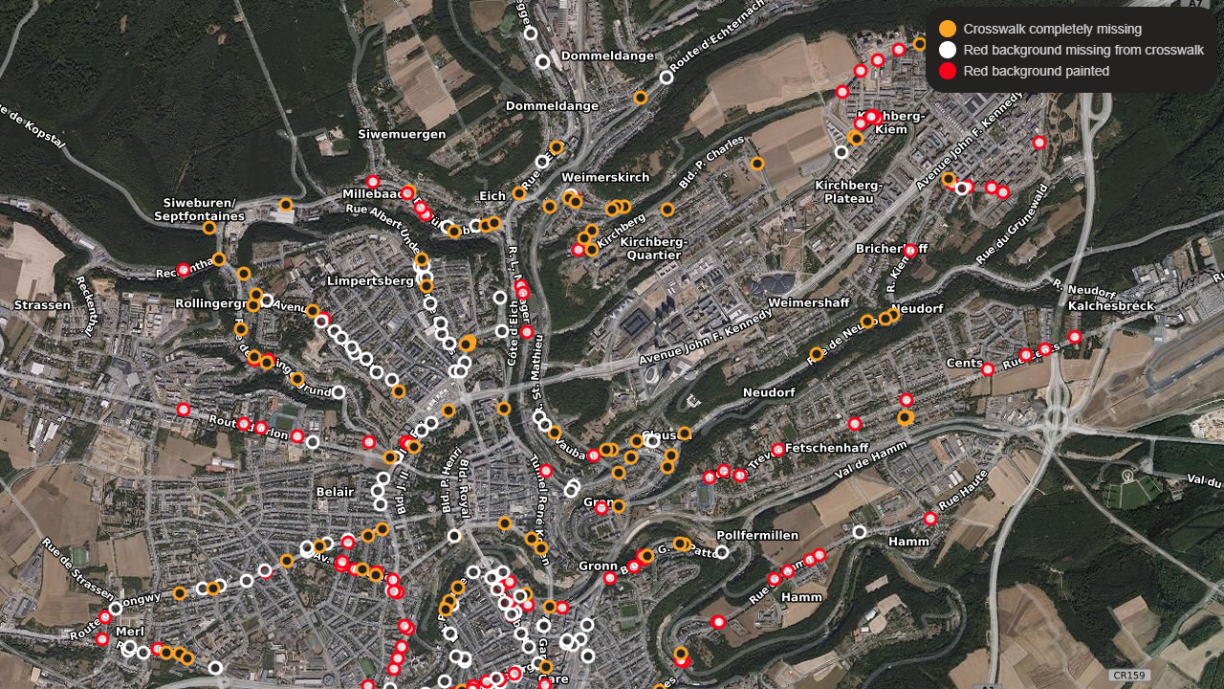 En 2021, le collectif a attiré l’attention des autorités communales sur 475 passages dangereux avec des places de parking trop proches. Leur nouveau projet montre que la ville continue d’échouer systématiquement à appliquer des directives en matière d’infrastructures piétonnes: “depuis 2022, nous sommes en procès contre la Ville de Luxembourg devant le tribunal administratif afin d’obtenir, en vertu de la loi sur la liberté d’information, l’analyse des passages piétons signalés en 2021. Malgré ces efforts, les responsables n’ont pas encore pris de mesures globales pour améliorer la situation à l’échelle de la ville”, selon un membre du collectif.