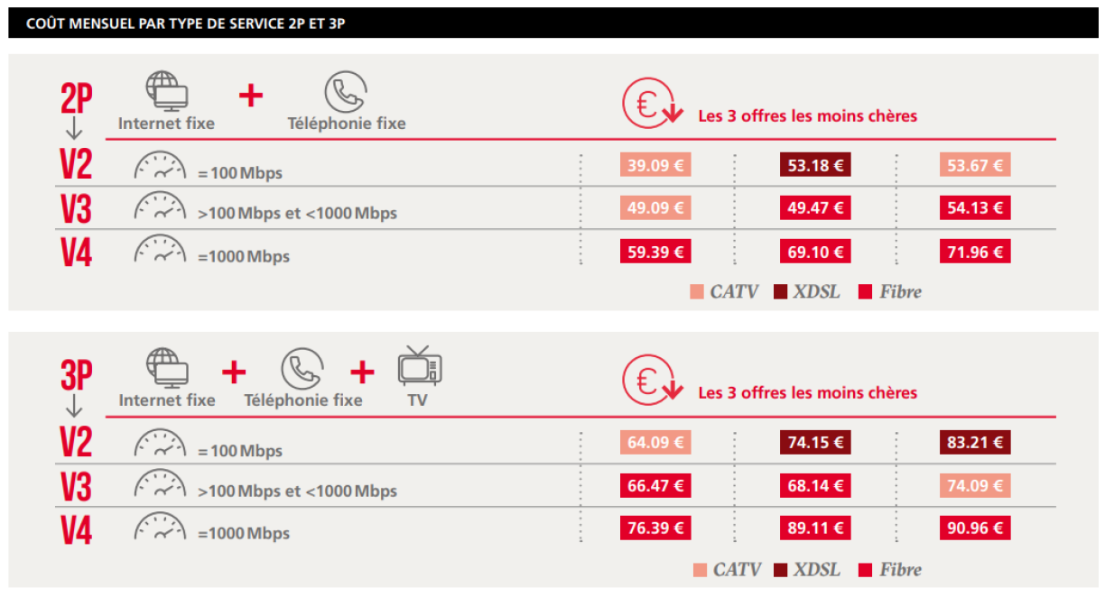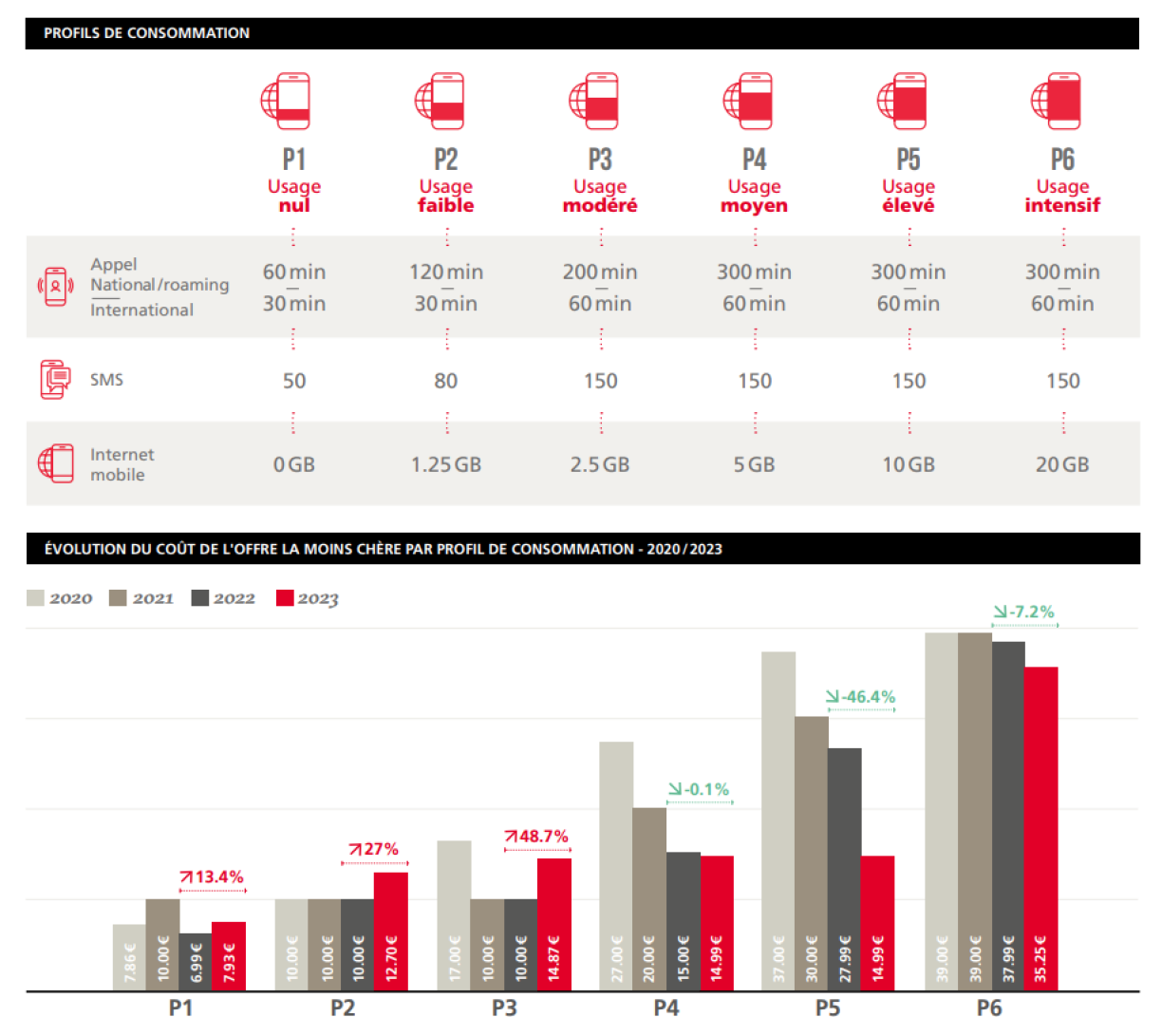 L’étude se penche notamment sur les offres les moins chères pour ses services mobiles. Ces offres attractives se situent entre 12.70 € pour les profils de consommation 1.25 GB d’Internet mobile et près de 14.99 € pour les profils de consommation 2.5 GB et 10 GB. Le profil de consommation “intensif” (avec au moins 20 GB) enregistre un coût mensuel de 35.25 € pour l’offre la moins chère.