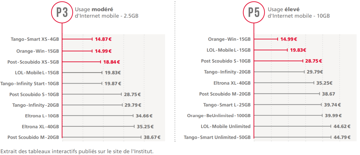 Il est toujours difficile de s’y retrouver dans la jungle des forfaits mobiles et internet fixe. L’ILR met justement à disposition des consommateurs des tableaux interactifs pour leur permettre de choisir parmi les offres les moins chères celle qui correspond au mieux à leur niveau d’usage d’Internet mobile. Evidemment, il faut bien se renseigner auprès des opérateurs concernés, car ces tarifs sont susceptibles d’avoir évolué depuis l’étude réalisée par l’ILR.