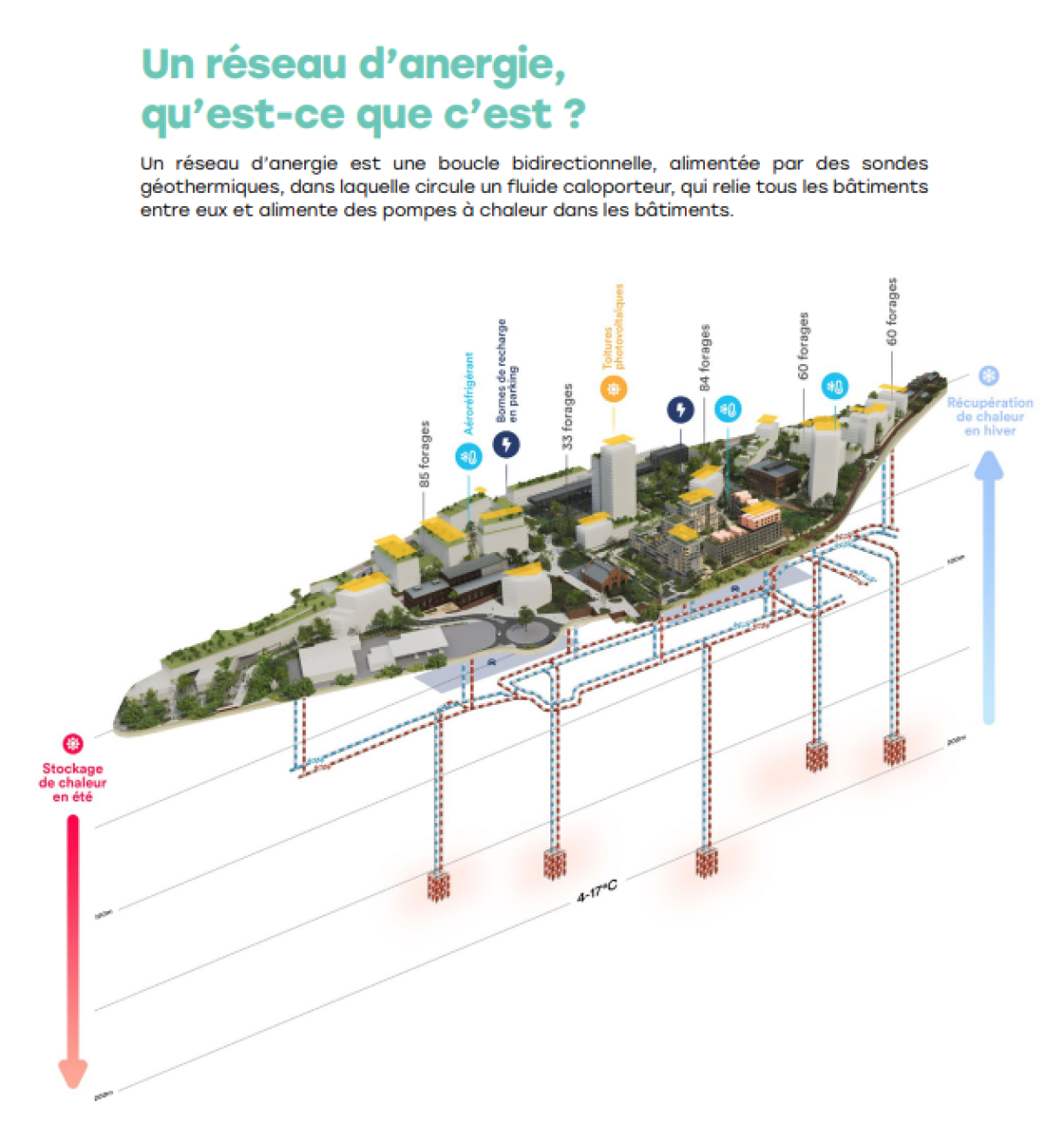 En clair, les besoins énergétiques des bâtiments du quartier seront comblés grâce à un système d’échange d’énergies se reposant sur plus de 300 forages géothermiques.
