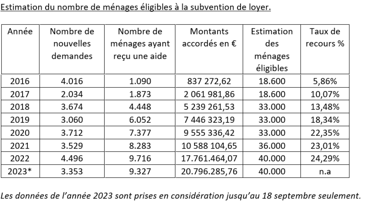 Bref, il y a urgence à mieux informer les ménages modestes, constate l’Observatoire. Le rapport détaille également le nombre de ménages éligibles à la subvention de loyer. On voit que le nombre de bénéficiaires s’est accru, tout comme les montants accordés, mais que le nombre de nouvelles demandes reste effectivement faible au regard du nombre de ménages éligibles.