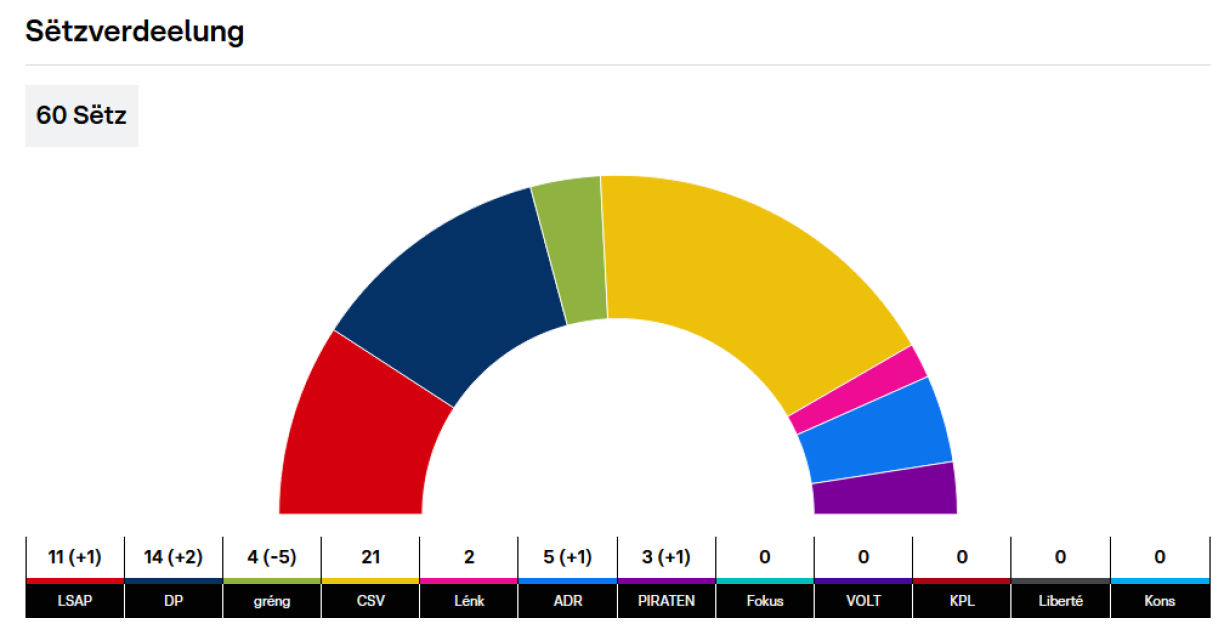 Le CSV peut arithmétiquement former une nouvelle coalition de gouvernement avec un des deux autres grands partis: le DP ou le LSAP. Le parti libéral emmené par Xavier Bettel sort renforcé de dix années au pouvoir et de ces élections législatives (+2 sièges) et cumule désormais 14 sièges. C’est clairement le second parti le plus fort du pays. Le parti socialiste de Paulette Lenert gagne aussi un siège supplémentaire mais n’en pèse que 11 à la Chambre.