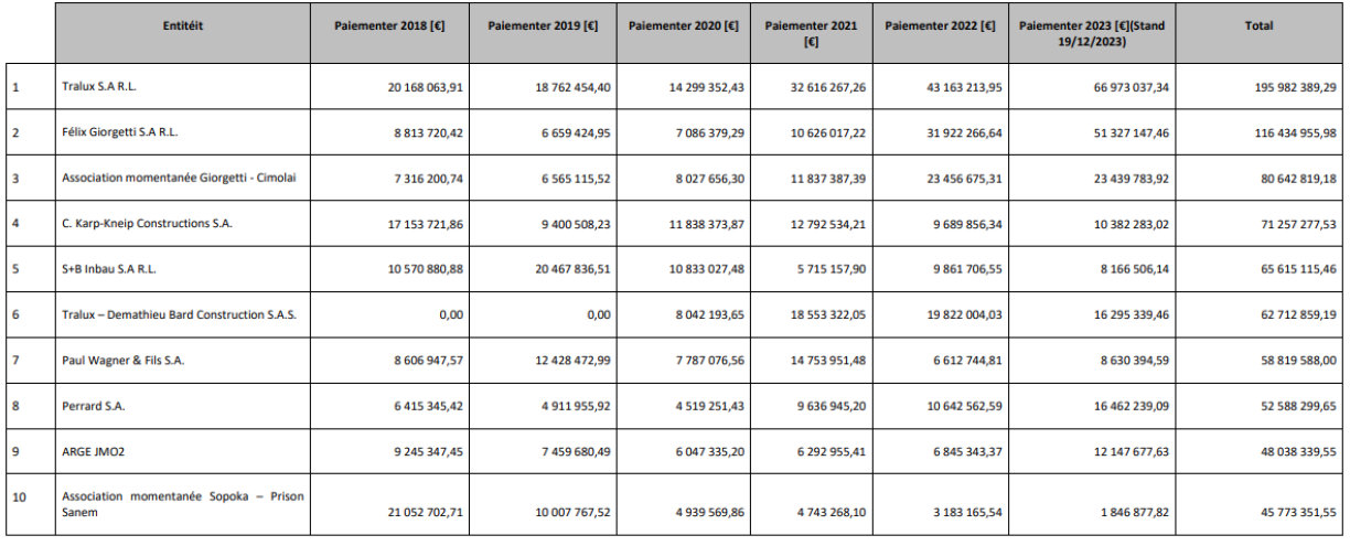 Sans surprise, on retrouve les grands noms de l’univers de la construction luxembourgeoise. Les entreprises Tralux S.a.r.l. et Felix Giorgetti S.a.r.l. ont amassé à elles seules plus de 300 millions d’euros entre 2018 et 2023.