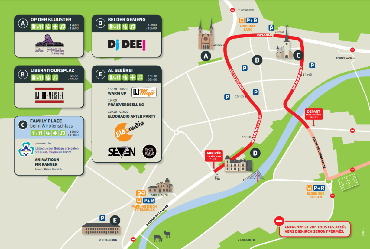 En raison de la cavalcade, un certain nombre de routes dans la région sont également fermées. Afin que les gens puissent arriver le plus rapidement possible sur place, des navettes seront déployées depuis Ettelbrück et Echternach.