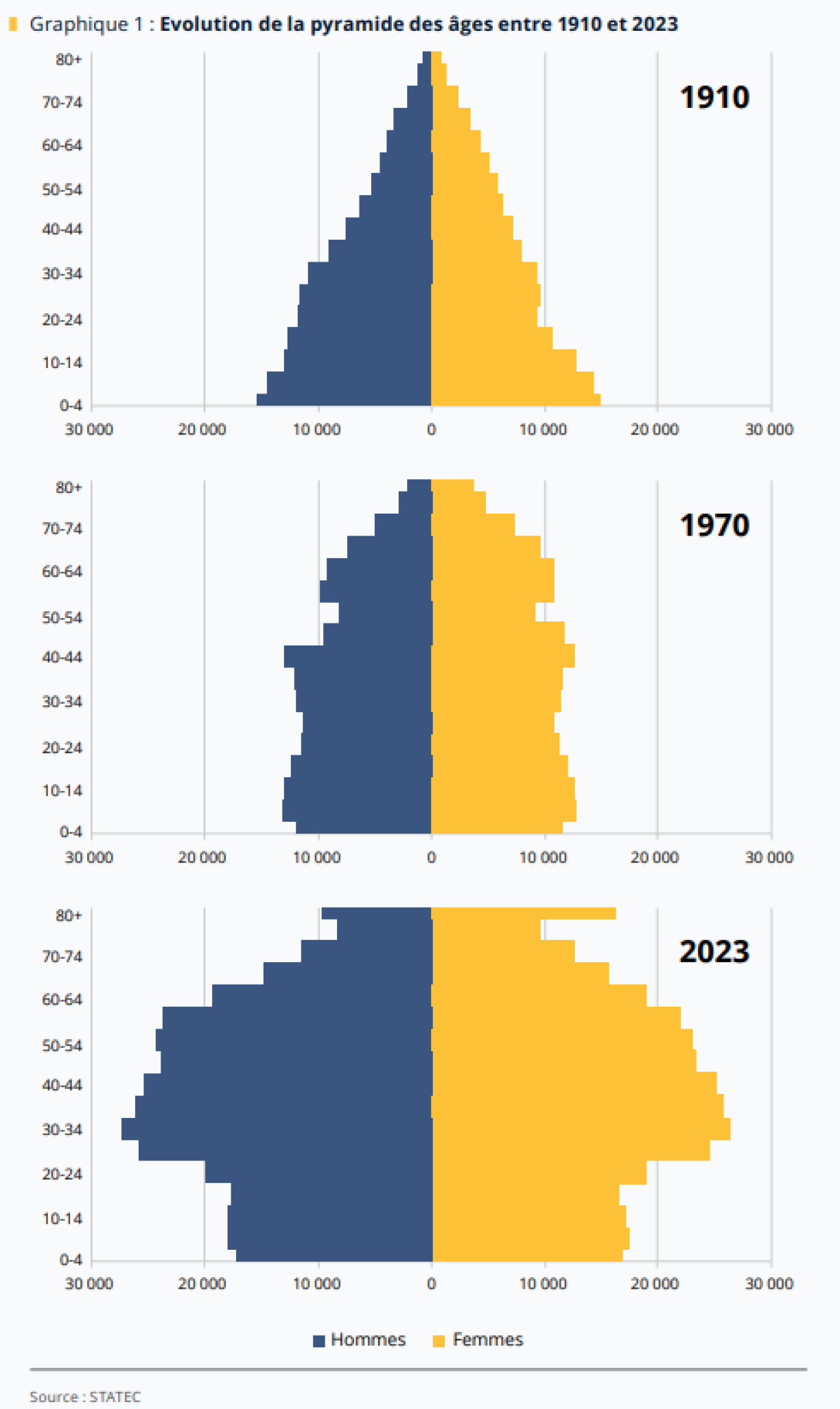 Ce vieillissement de la population saute aux yeux avec les graphiques ci-dessous. En 1910, la pyramide des âges luxembourgeoise méritait encore son nom. En 2023, cette pyramide prend des proportions inégales, enflant notamment en son centre et à son sommet. Or, ce déséquilibre démographique va poser de nombreux défis, à commencer par celui du financement des pensions.