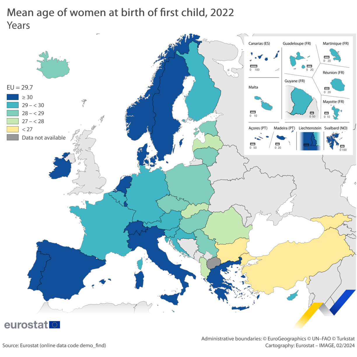 Alors qu’on comptait en moyenne 2,29 enfants par femme en 1960, ce taux a chuté à 1,66 en 2022, et il n’était plus que de 1,31 en 2022. Soit en dessous de la moyenne de l’UE (1,46). Le taux le plus haut en 2022 était en France avec 1,79 et le plus bas à Malte avec 1,08. En Belgique, il était de 1,53, en Allemagne de 1,46 et au Portugal de 1,43.