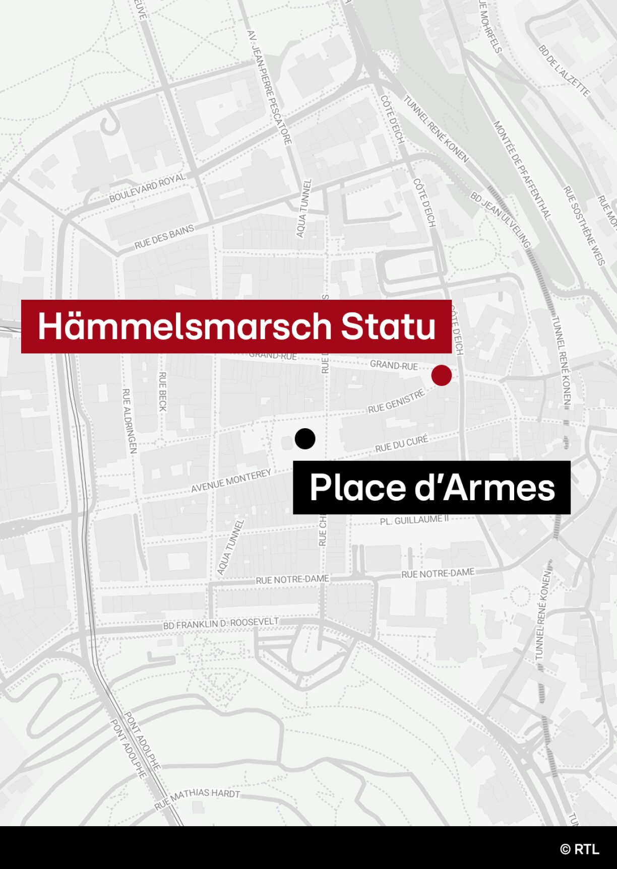 Le jeudi 21 mars à 6h00, la sculpture “Hämmelsmarsch” est revenue Place du Puits-Rouge. L’œuvre en bronze installée au “Roude Pëtz” depuis 1982 avait été exposée aux intempéries 40 ans durant. En octobre dernier, la sculpture avait été démontée afin d’être transportée à Saint Rémy-les-Chévreuse, près de Paris, pour y être restaurée.