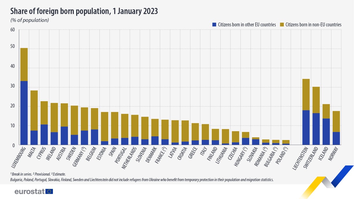 Le dernier recensement du Statec, en 2021, étayait déjà ce constat, en comptabilisant 49,3% de résidents nés à l’étranger (soit 304.000 personnes). La barre des 50% a depuis été franchie, nous apprend cette semaine Eurostat : au 1er janvier 2023, plus de la moitié (50,4%) de la population luxembourgeoise était née à l’étranger.