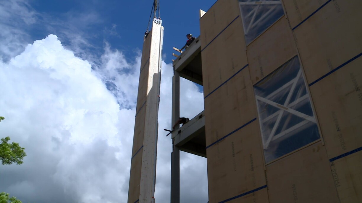 “Nous avons commencé en janvier, ce qui signifie que le gros oeuvre a été terminé en quatre mois. Les façades devraient être finies dans deux mois. Cela signifie que le bâtiment sera terminé en 12 mois et que nous emménagerons donc fin décembre. 12 mois, c’est plutôt rapide, mais c’est grâce à ce qui touche à la fabrication des éléments et de toute l’étude réalisée en amont.”
