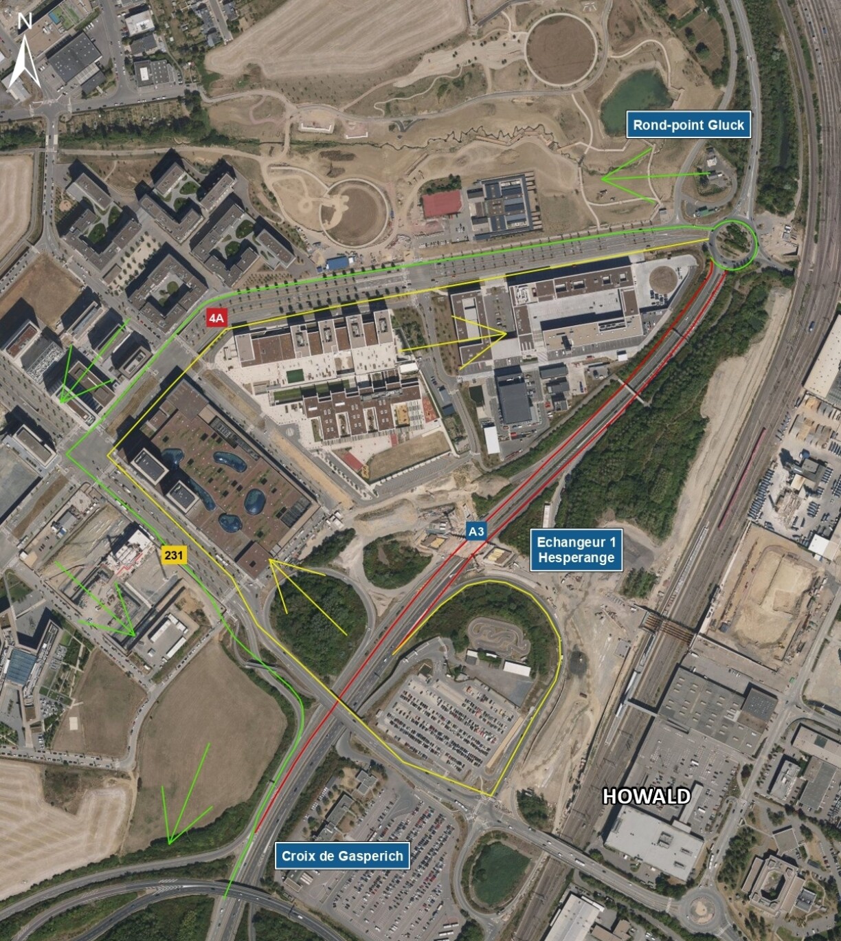 Le trafic en provenance de l’autoroute A3 et en direction de Luxembourg-Ville sera dévié à partir de l’échangeur Hesperange via le CR231 (boulevard F.W. Raiffeisen) et la N4A (boulevard de Kockelscheuer).