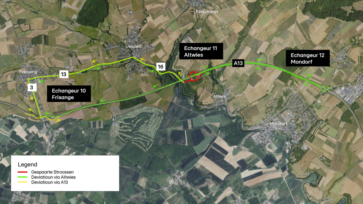 Enfin, le trafic en provenance de la N16 et en direction de l’A13 sera dévié à partir de l’échangeur Altwies via la N16, la N13, la N3 et l’échangeur Frisange.