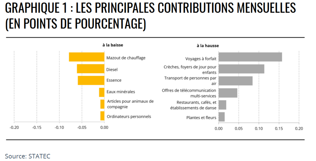 Des hausses ayant un impact visible sur l’inflation ont été relevées pour les plantes et fleurs (+2.7%), les hôtels, motels et auberges (+1.5%) et le tabac (+1.2%).
