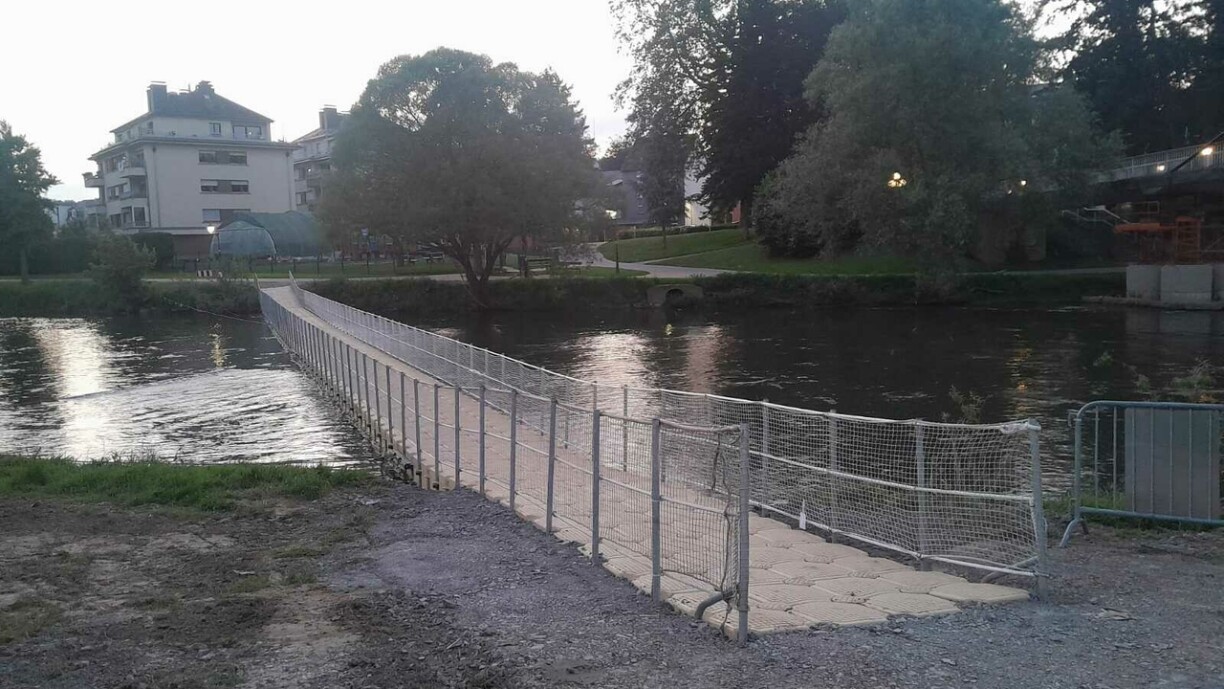 La commune de Diekirch a souhaité proposer une alternative sans perdre de temps afin de permettre aux nombreux élèves qui traversent la Sûre pour rejoindre les écoles du campus Merten. Un pont flottant a donc été installé juste à côté de la passerelle au début du mois de mai.