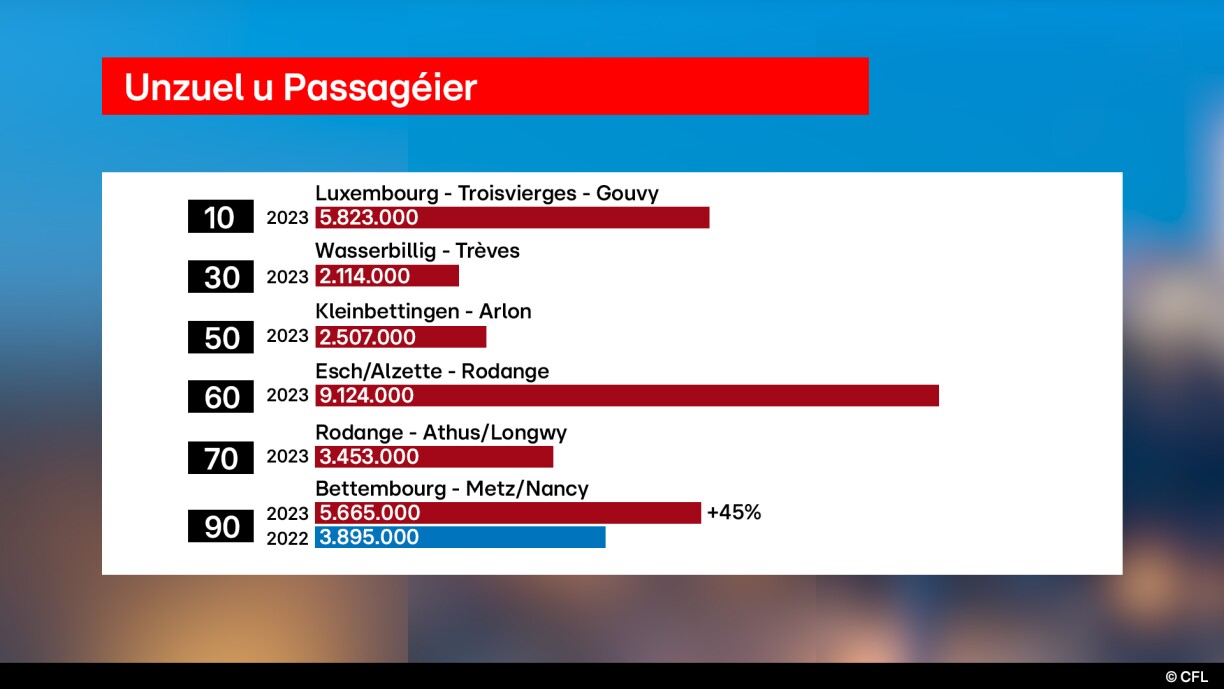 La ligne ferroviaire la plus fréquentée est la ligne Luxembourg-Esch-Rodange. La ligne 90, très utilisée par les frontaliers, a également vu sa fréquentation augmenter depuis plusieurs années. Sur cette ligne, après le chantier d’extension autour de Bettembourg, c’est-à-dire à partir de 2028, un train circulera toutes les 7 minutes depuis Thionville vers Luxembourg. Cependant, l’expansion de nombreuses lignes implique des chantiers, donc une ponctualité limitée, explique le directeur général: