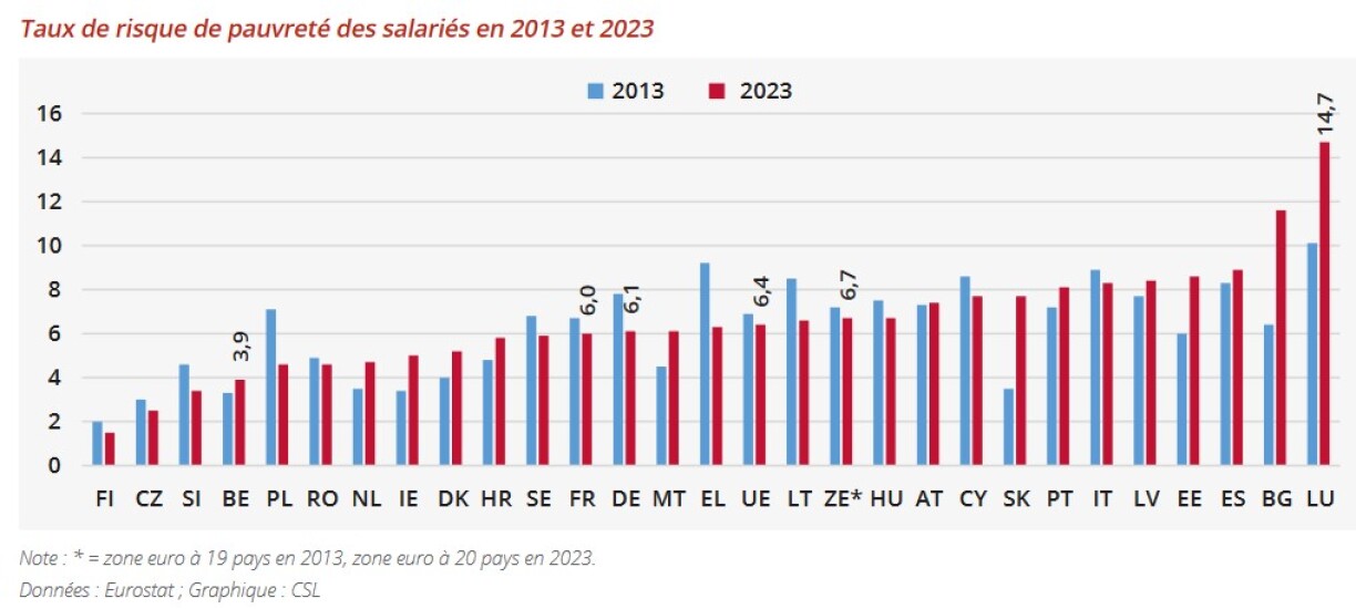 Ainsi, en 2022, ce sont 12,4% des salariés de 16 à 64 ans qui sont exposés au risque de pauvreté, contre 6,7% en moyenne dans l’union monétaire. D’après les nouvelles données publiées par Eurostat pour l’année 2023, le Luxembourg confirme son statut de champion de la pauvreté au travail puisqu’il affiche désormais une proportion de travailleurs exposés à la précarité qui s’élève à 14,7%.