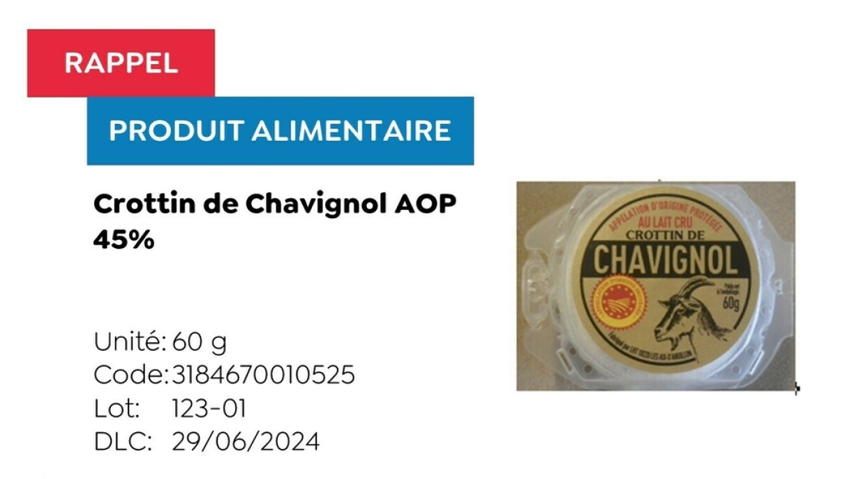 Le premier produit est vendu au poids de 60 grammes, son code barre est le suivant: 3184670010525, la date limite de consommation est le 29/06/2024 et e lot concerné est 123-01.