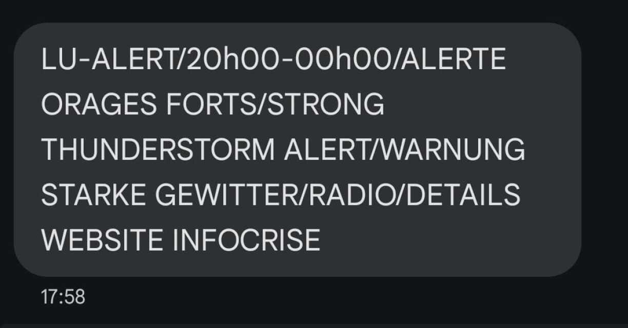 La Cellule d’évaluation du risque intempéries (CERI) a envoyé un SMS dans la soirée pour avertir des orages. Cependant, tout le monde n’a pas reçu le SMS. Voici le message qui a été envoyé: