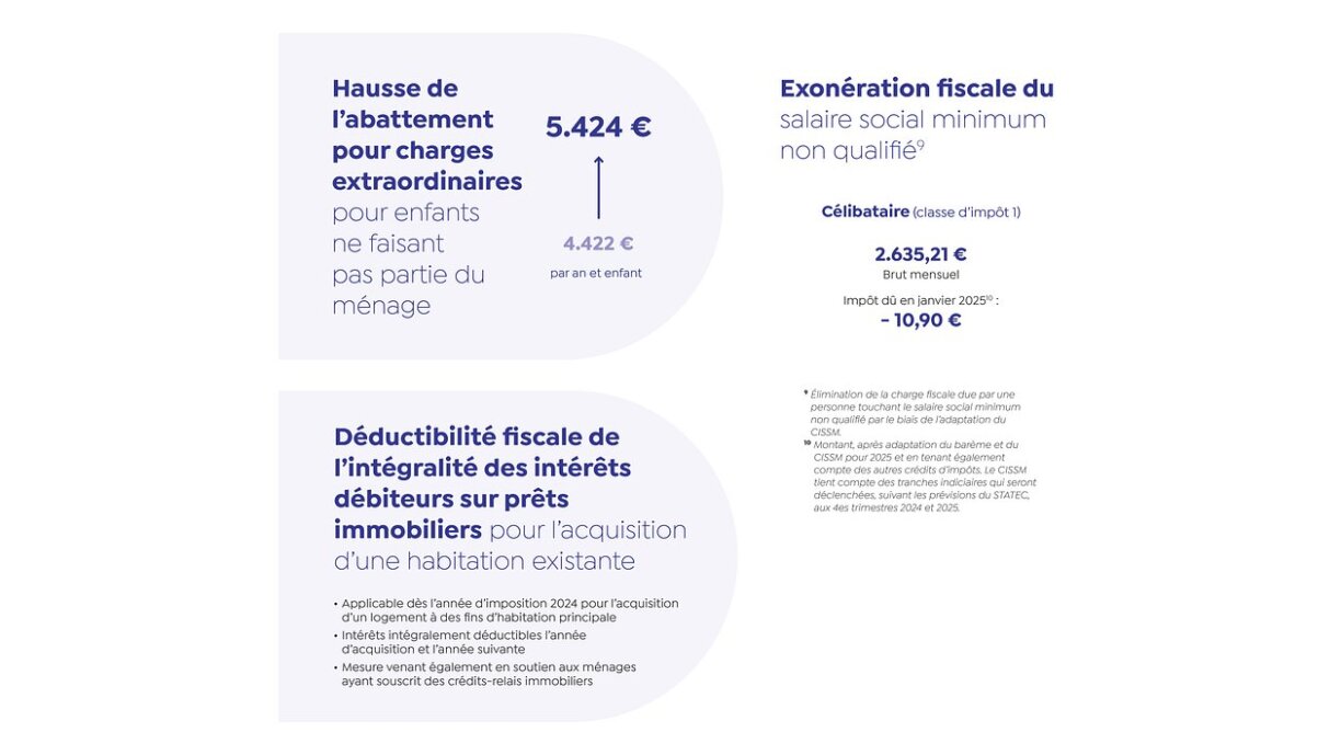 À commencer par une nouvelle adaptation du barème d’impôt au 1er janvier 2025. Déjà abaissé de quatre index début 2024, la prochaine baisse sera équivalente à 2,5 index. Soit environ 6,3% d’impôt en moins pour tous ! “Si les gens ont plus de revenus disponibles, ils dépenseront davantage, cet argent va revenir dans l’économie” a estimé le ministre Gilles Roth, lors de la présentation des mesures.