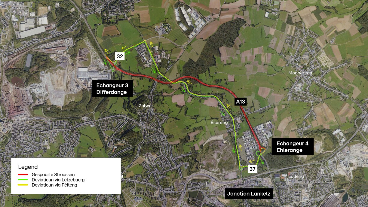 Deux bretelles d’accès dont celle de l’échangeur Ehlerange vers l’A13 direction Pétange et celle de l’échangeur Differdange vers l’A13 direction Esch seront également fermées. En ce qui concerne le trafic provenant de l’A4, il sera dévié via la N37, le CR110, la N32 et l’échangeur Differdange.