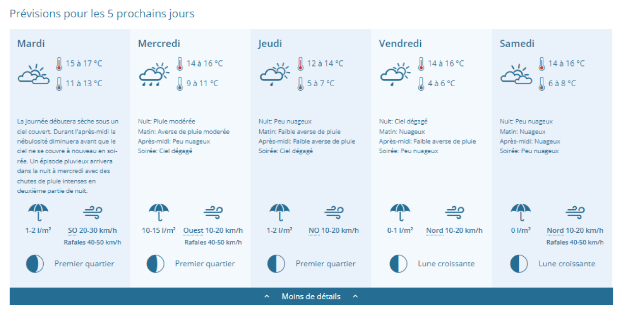 Attention également au vent certains jours, notamment de ce lundi à mercredi où des rafales jusqu'à 50 km/h sont attenduzs.