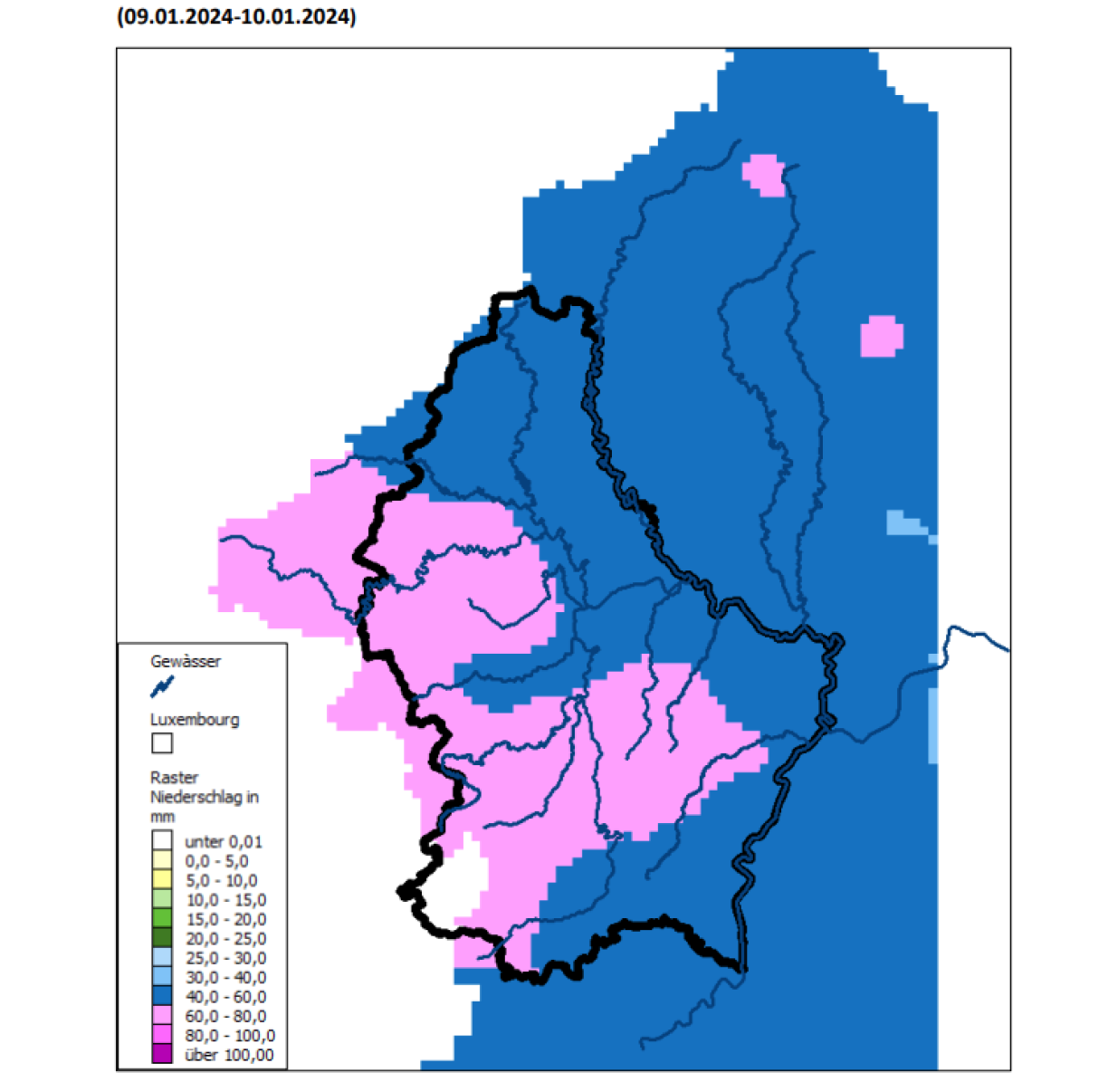 L’Administration de la gestion de l’eau a publié une carte montrant où le niveau de pluviométrie a été le plus élevé au Luxembourg au cours des 24 dernières heures.