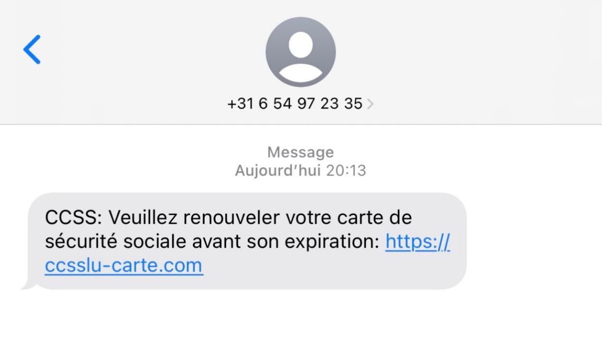 Le CCSS rappelle que toute nouvelle carte est bien évidemment gratuite et qu'il ne demande jamais les détails des cartes de crédit aux citoyens. On voit également que ce SMS provient d'un numéro étranger, en l’occurrence des Pays-Bas (+31) dans notre exemple et que l'adresse renseignée dans le message n'est pas l'adresse officielle du CCSS.