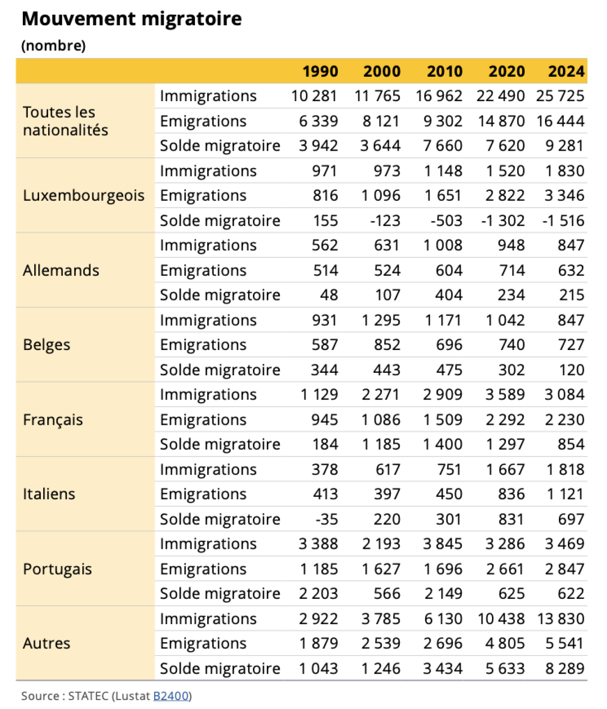 Globalement, le Luxembourg continue d’accueillir plus de personnes qu’il en voit partir. Les chiffres de l’immigrations provenant d’ailleurs (“autres” nationalités) sont au plus haut (13.830) même si les départs le sont aussi (5.541). Le solde reste donc largement positif (8.289).