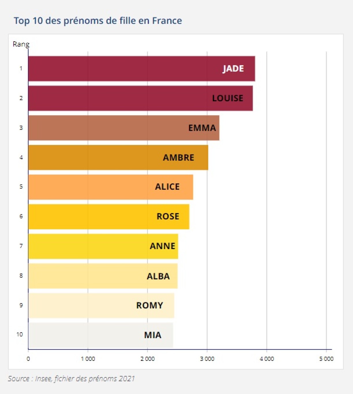 Chez les filles, honneur aux “Jade": elles 3.802 à avoir reçu ce prénom. Elle se place tout juste devant “Louise” et “Emma”. “Ambre” et “Alice” complètent le top 5. Viennent ensuite “Rose”, “Anne”, “Alba”, puis “Romy” et finalement “Mia”.