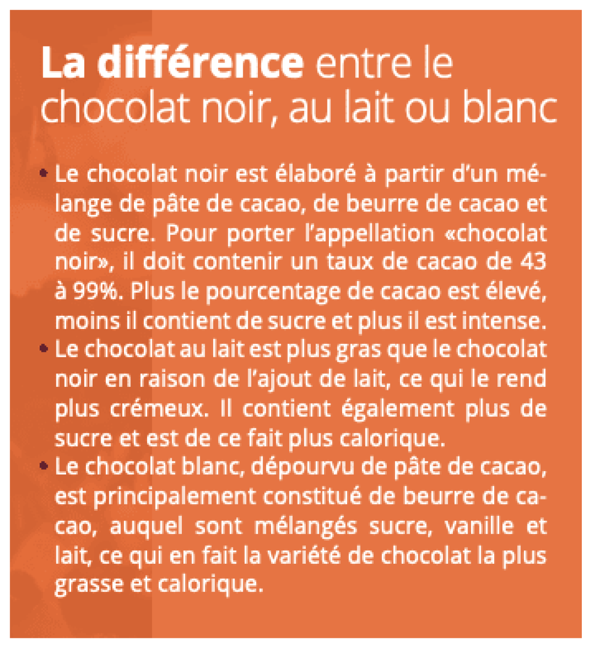 Amélioration de l’humeur : le chocolat contient des composés tels que la sérotonine et les endorphines qui peuvent stimuler la sensation de bien-être et aider à soulager le stress.