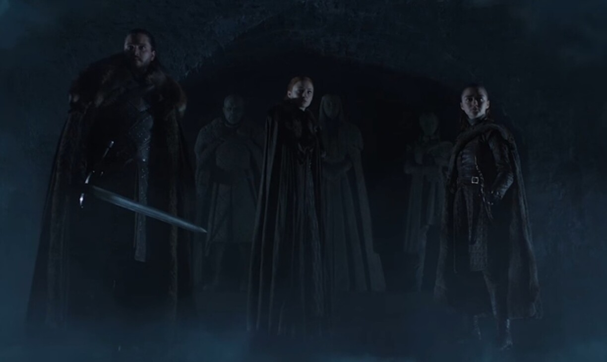 Nous retrouvons Jon Snow, Sansa et Arya Stark au fond du caveau de Winterfell, devant les statues de leurs ancêtres. Ils tombent alors sur leur propre réplique, figée dans la pierre, avant qu’air froid, lugubre, n’envahisse la pièce. Jon et Arya finissent par dégainer, prêts à recevoir la menace venue du nord.