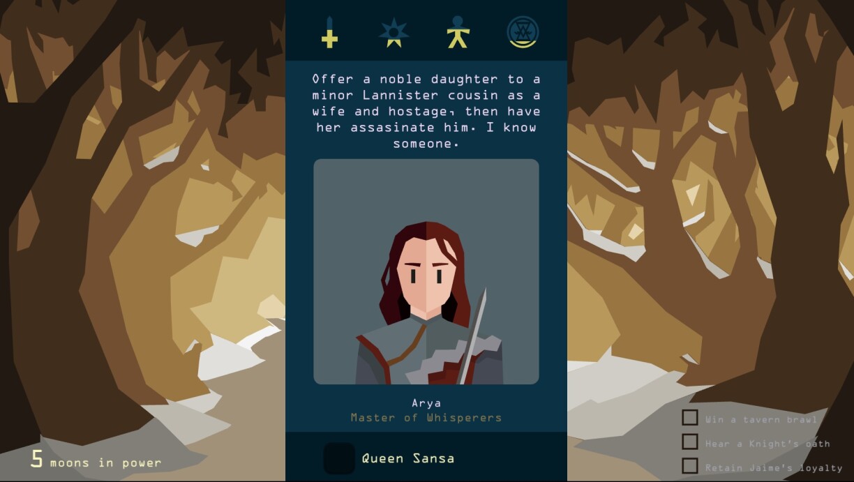 Au début, notre choix de personnage se limite à Daenerys Targaryen, la mère des Dragons, mais très vite, d’autres figures cultes de la saga (oui, Jon Snow par exemple!) se débloquent. Les fans apprécieront l’ambiance du jeu, nourrie par la bande-son originale de la série, et ce parti-pris graphique, très minimaliste, mais au charme certain. Et puis, comme le propos se situe entre la saison 7 et la saison 8, le jeu permet d’oublier l’espace d’environ dix minutes (par partie) l’issue finale de la série télévisée qui a traumatisé plus d’un fan...