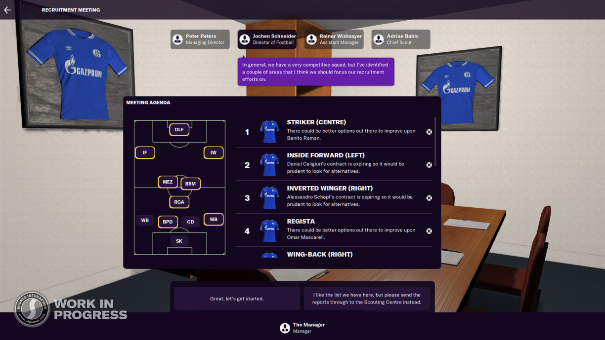 La nouveauté qui devrait intéresser le plus de joueurs concerne le marché des transferts. Une réunion de recrutement permettra au manager que l’on incarne de poser les bases du futur recrutement, en fonction de la stratégie du club et en accord avec le personnel. Ce sera l’occasion, aussi, de cibler les postes et les critères à rechercher en priorité. Les interactions avec les agents de joueurs ont été améliorées afin d’obtenir plus de détails sur la possibilité de recruter tel ou tel joueur, et à quelles conditions.