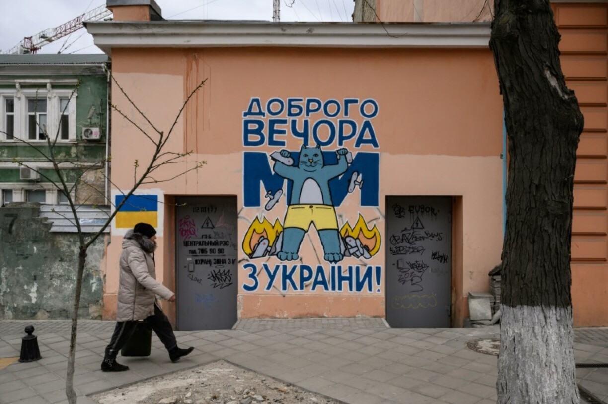 Sur une artère d’Odessa (sud-ouest), un chat bleu sourit, un tas d’avions russes à ses pieds. Depuis le début de la guerre, un collectif de street-art a peint des dizaines de félins sur les murs de la ville, témoignage de l’insouciance presque irréelle régnant dans cette partie de l’Ukraine.