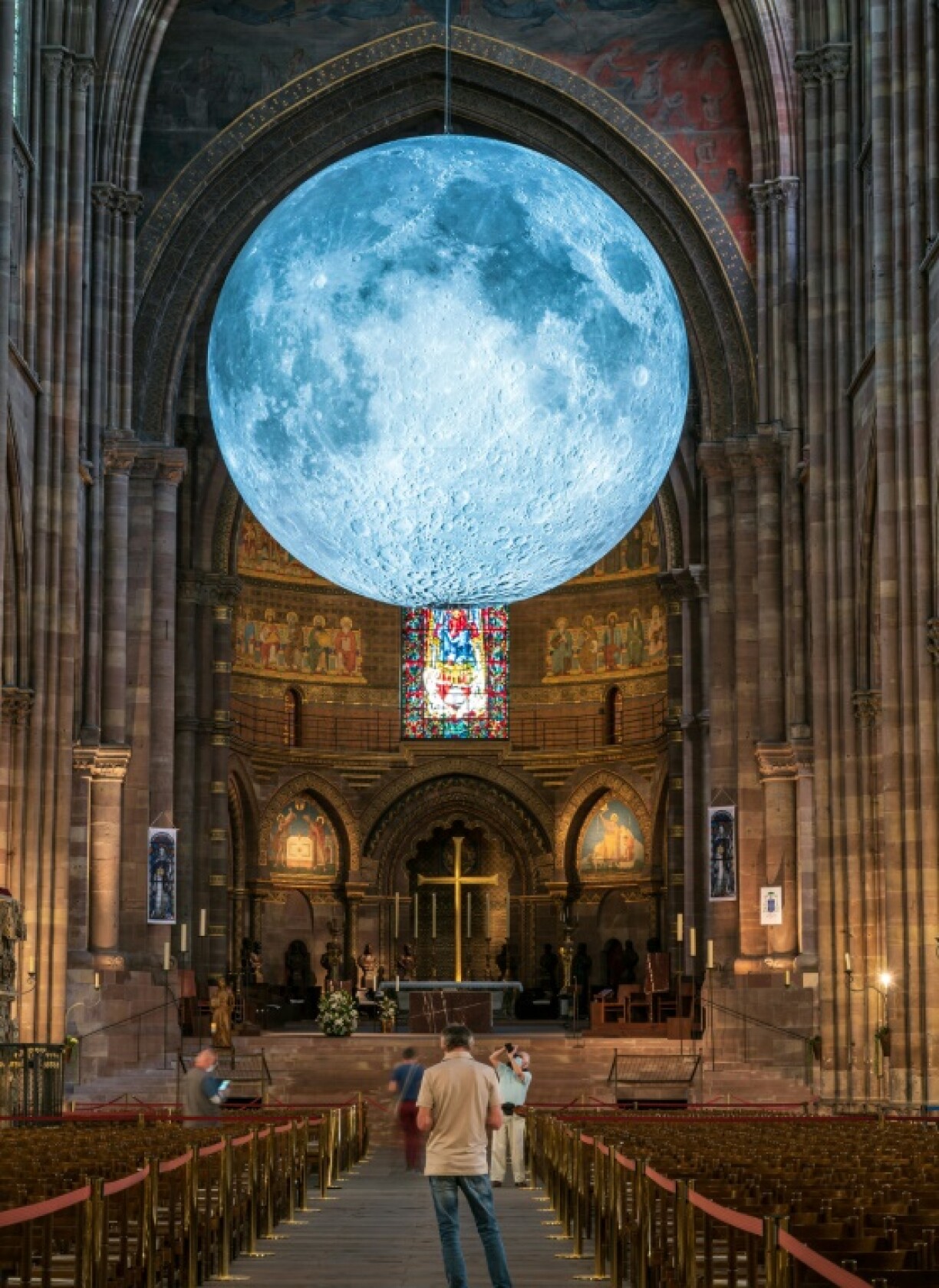 Suspendue dans la nef de la cathédrale, la lune de Luke Jerram est une sphère gonflable de sept mètres de diamètre sur laquelle sont projetées les images de l’agence spatiale américaine.