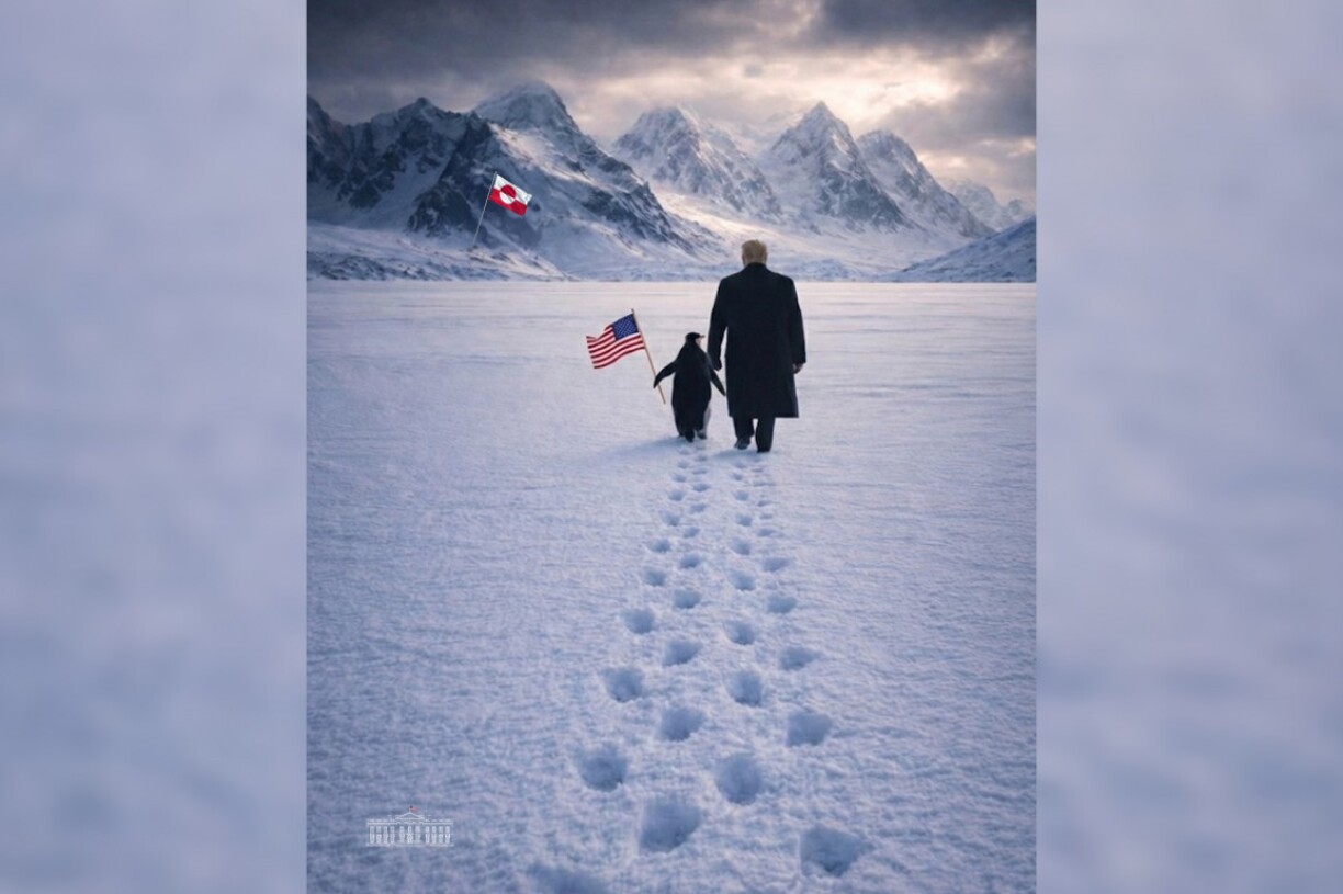 Donald Trump n’a visiblement pas renoncé à son intérêt pour le Groenland. Cette semaine, la Maison Blanche a partagé sur le réseau social X une image générée par intelligence artificielle représentant le président américain marchant dans un paysage enneigé, montagnes en arrière-plan et drapeau groenlandais flottant au loin. Le message accompagnant la publication se voulait léger : « Embrace the penguins » (« Adoptez les manchots »).