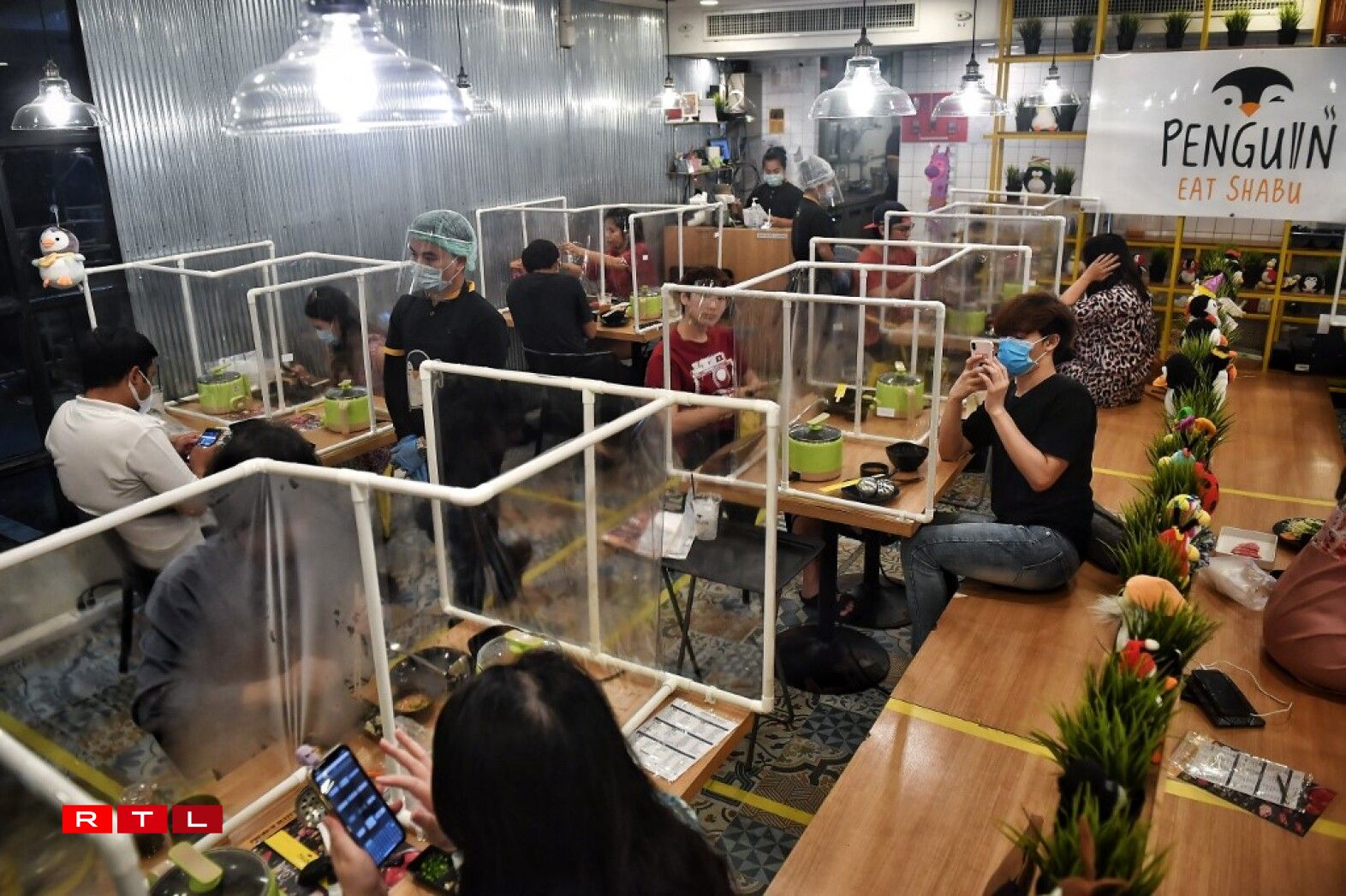 De son côté, le designer décorateur Christophe Gernigon a imaginé Plex’Eat, un projet de visières géantes. Chacun des clients a sa propre cloche, qui est ouverte sur l’arrière pour l’accès et éviter d’étouffer. Il est ainsi protégé des gouttelettes de ses voisins. Plex’Eat n’est qu’au stade de projet, mais un industriel serait en train de plancher sur une potentielle commercialisation…
