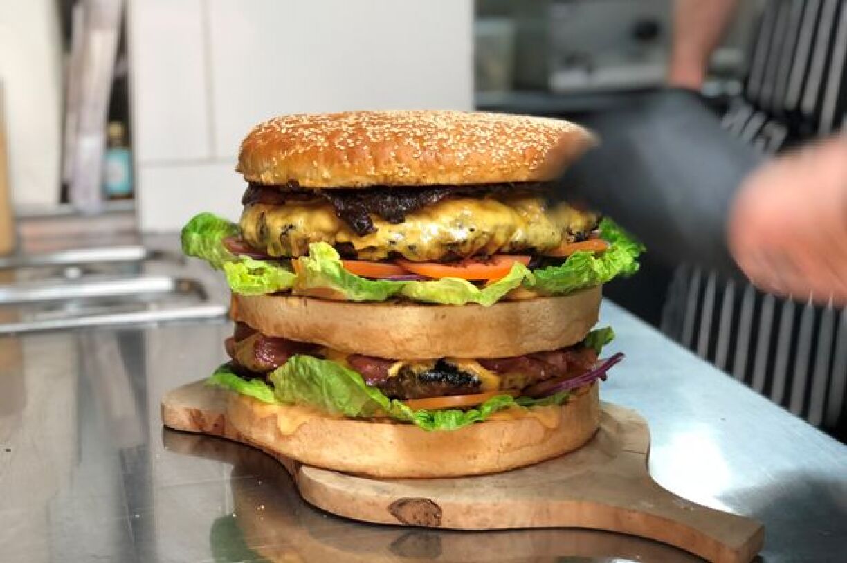 Appelé “The Beast”, ce burger consiste en trois kilos de viande transformés en deux galettes de 1,5 kg, trois pains, 40 tranches de fromage, 20 tranches de bacon, deux laitues entières, deux oignons rouges, cinq tomates cœur de bœuf, un litre de sauce à hamburger et 500 g d’oignons caramélisés.