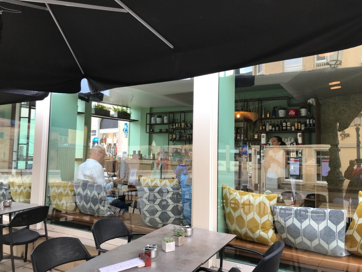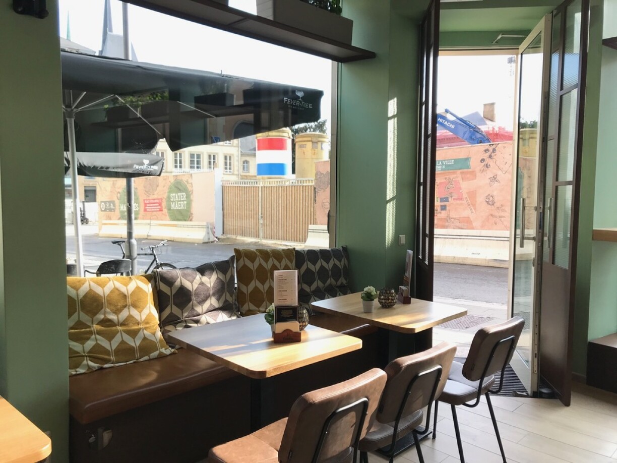 Le cadre est douillet, avec un beau turquoise aux murs, des gros coussins et un beau bar où office Olivier qui a déjà pu nos régaler de ses cocktails en d’autres lieux. La terrasse avec vue sur le Palais Grand-Ducal (et le travaux de la place Guillaume II) est un des atouts du lieu.