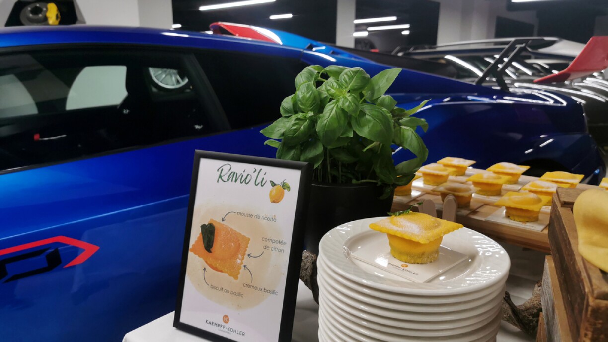 Florian Chauvière, pâtissier du Skybar et élu fraîchement pâtissier de l’année par le guide Gault&Millau, a marqué des points avec sa pizza à la pâte briochée et à la figue, clin d’oeil à la Scuderia Ferrari. Fidèle du collectif, Jonathan Szymkoviak, des restaurants Kaempff Kohler, a aussi porté haut les couleurs de l’Italie avec son ravioli au biscuit et au crémeux basilic, mousse de ricotta et compotées de citron... même si les regards se sont autant portés sur la Lamborghini Huracan STO bleu métallisé exposée à ses côtés.