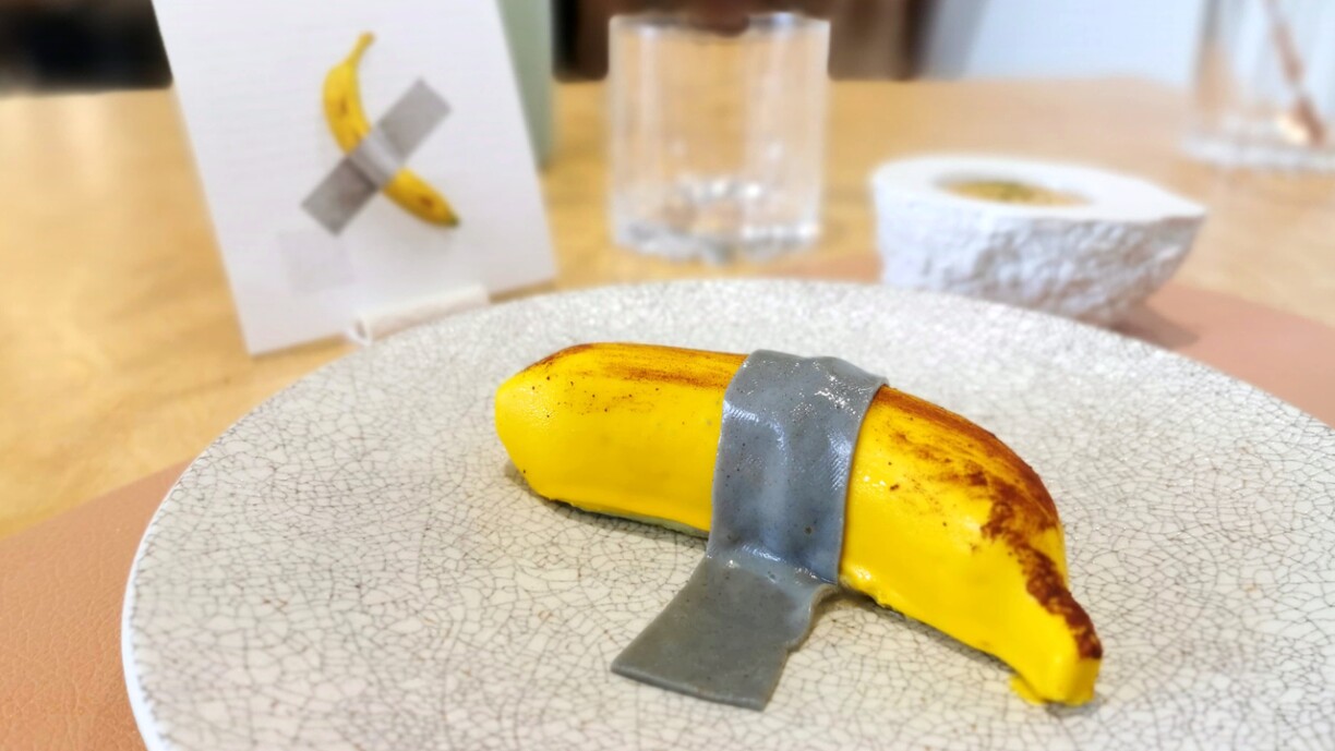 C’est un dessert qu’on n’est pas prêt d’oublier. Autant pour son apparence – une banane scotchée dans une assiette – que pour tout ce qu’il raconte. D’un simple clin d’œil, Charles Coulombeau, chef des deux restaurants du Centre Pompidou-Metz “Umé” et “Yozora”, transforme un geste artistique devenu viral (la banane scotchée de Maurizio Cattelan s’est vendue à 6,2 millions de dollars, fin 2024) en une création sucrée à la fois malicieuse et raffinée. Dans l’assiette, on retrouve bien cette silhouette jaune familière, tenue par une bande de scotch : sauf qu’ici, tout est comestible. Et nous avons pu la déguster.