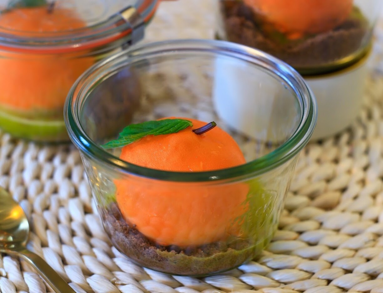 Pour le dessert, on se laisse faire par ce trompe l’œil en forme de mandarine, chocolat blanc et basilic. La peau de la mandarine est en chocolat blanc, avec à l’intérieur une mousse mandarine et un cœur coulis de mandarine basilic. Autour crumble de chocolat et jus mandarine basilic.