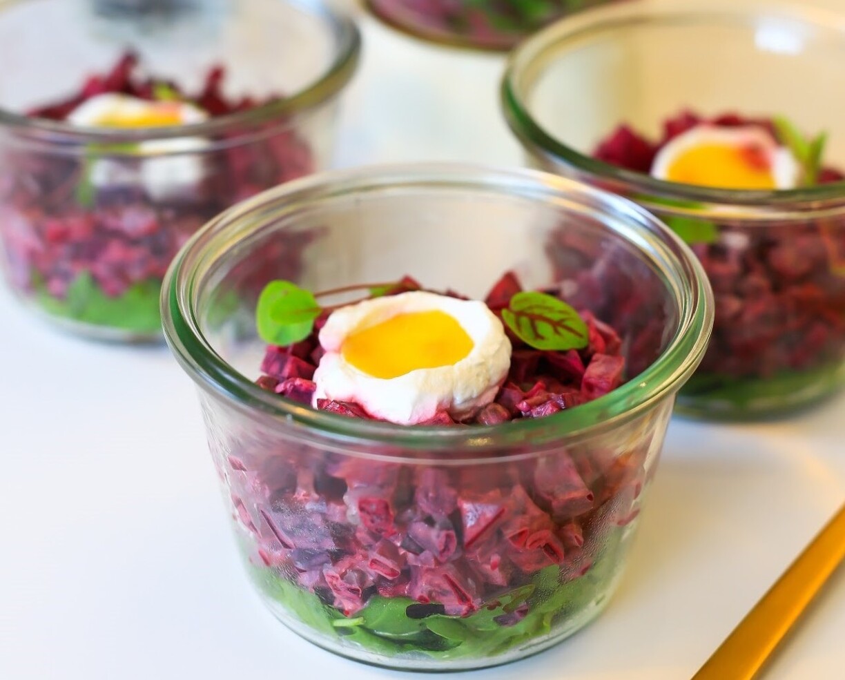 On découvre par exemple un tartare de légumes pourpres (betteraves rouges, chioggia et crapaudine, carottes pourpres). Les légumes sont mélangés dans une “vinaigrette tartare végétale”: pickles d’oignons rouges, cornichons, câpres, estragon, tabasco, moutarde, jus de légumes. Pour que l’illusion soit parfaite, un “œuf” est figuré avec une émulsion (crème à base de noix de cajou) au raifort avec une rondelle de carotte.