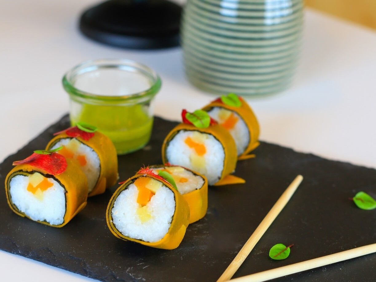 Petite escapade d’inspiration asiatique pour ce maki de potiron et coing, jus tonique. Ce jus est fait à base de jus de pomme, feuille de citron kéfir, gingembre, jus de citron jaune et vert, sucre de fleurs de coco.