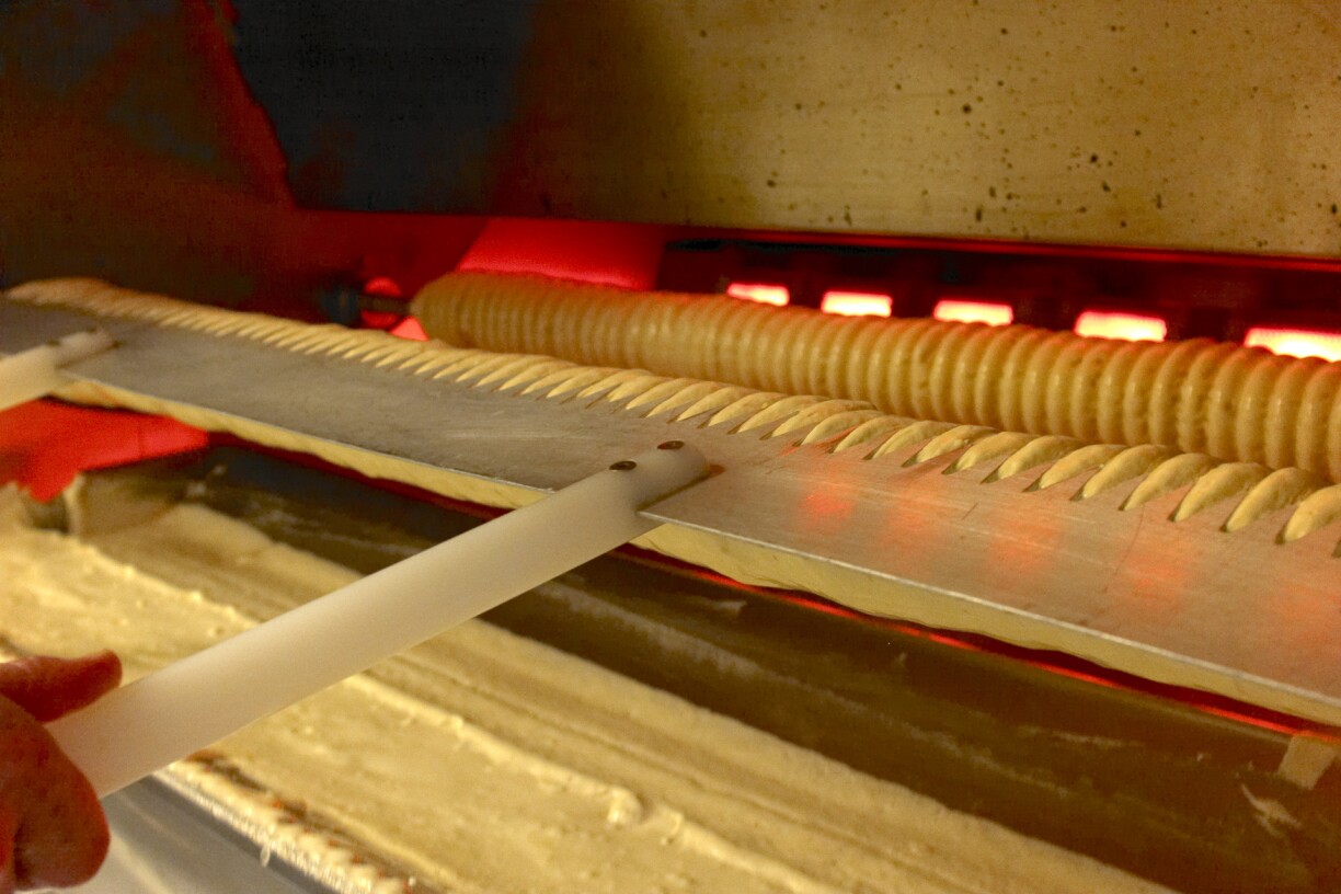 Le gâteau est peigné régulièrement pendant la cuisson, à l’aide d’un ustensile spécialement développé à cet usage; ce qui donne au produit final la forme d’un gâteau en anneaux.