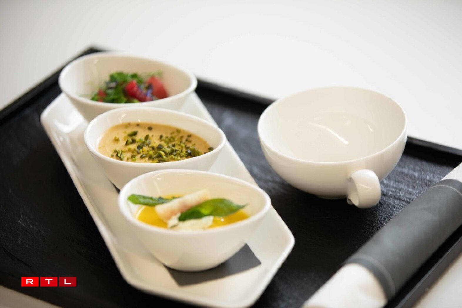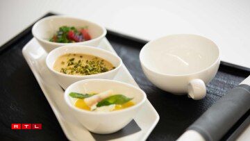 Pour le chef René Mathieu “l’expérience a été extrêmement intéressante dans cette démarche de recherche de qualité et de raffinement compte tenu des contraintes du service en vol.” Il a apporté ses connaissances et sa sensibilité pour une cuisine qui se concentre sur les richesses offertes par la nature et se caractérise par une cuisine saine, colorée et goûteuse.
