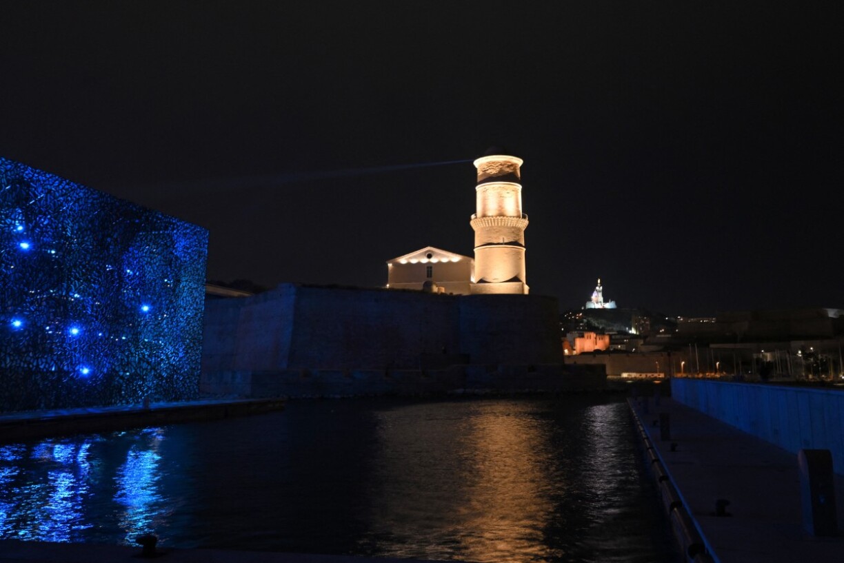 Depuis mi-janvier et jusqu’en juillet, c’est à l’aube, une heure avant le lever du soleil, et au crépuscule, durant une heure après le coucher du soleil, que surgit par intermittence ce rai de lumière depuis la tour du Fanal, construite en 1644 à l’entrée du Vieux-Port et aujourd’hui partie du Mucem, ce musée de société pour qui l’art peut soutenir face à la maladie.